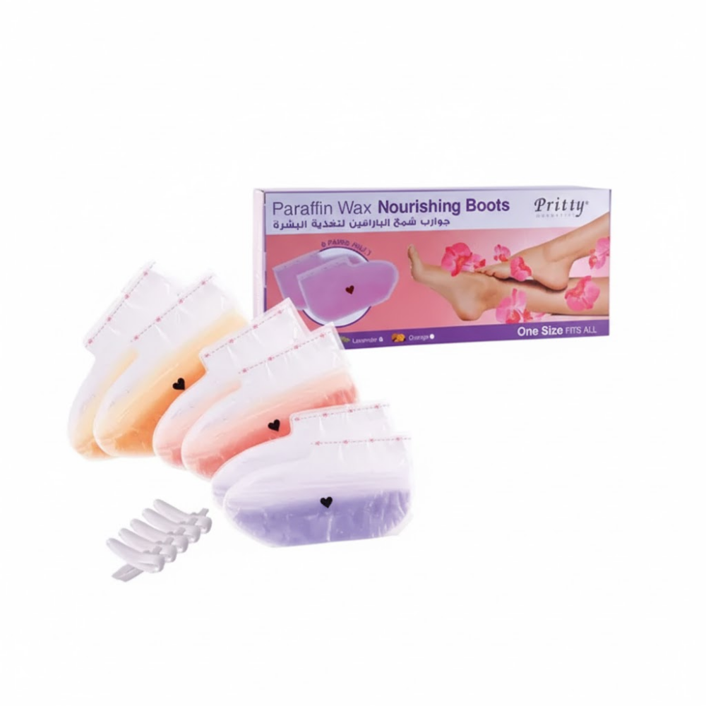جوارب بريتي المغذية للقدمين بشمع البارافين، جوارب معالجة بالبارافين، غنية بمكونات مغذية لتنعيم وتنشيط القدمين الجافتين. ترطب البشرة وتنعمها وتصقلها، وتتركها منتعشة وناعمة كالحرير، مثالية لعلاجات السبا المنزلية.