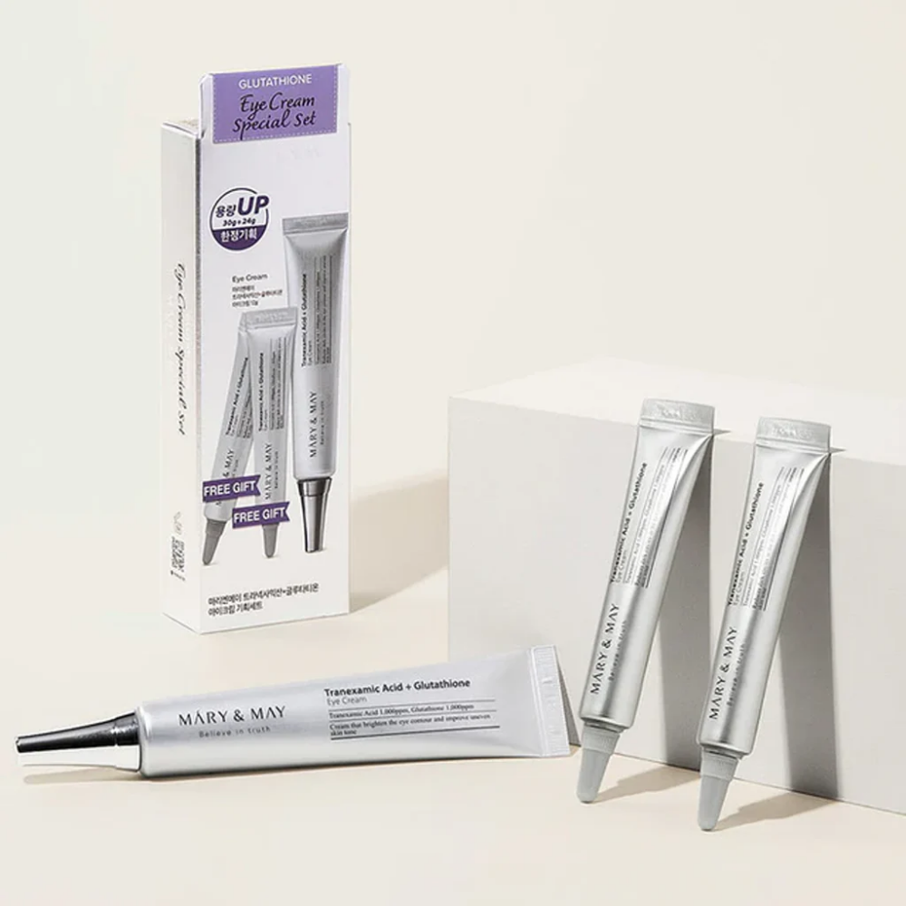 مجموعة ماري آند ماي الخاصة بكريم العين بالجلوتاثيون هي مجموعة شاملة للعناية بالعينين، تتمحور حول مضاد الأكسدة القوي الجلوتاثيون، الذي يُعرف غالبًا بأنه مضاد الأكسدة الرئيسي في الجسم لقدرته الاستثنائية على تحييد الجذور الحرة، وتفتيح لون البشرة، وتثبيط إنتاج الميلانين المسؤول عن الهالات السوداء وتغير لون منطقة تحت العين. تتضمن هذه المجموعة الخاصة منتجات متعددة مصممة للعمل معًا كنظام متكامل لعلاج العين بالجلوتاثيون، حيث توفر فوائد مركزة لتفتيح البشرة، ومكافحة علامات التقدم في السن، وترطيب منطقة ما حول العين الحساسة من خلال نهج متعدد الخطوات متناغم. تستهدف خصائص الجلوتاثيون القوية لتفتيح البشرة التصبغات العنيدة التي تجعل الهالات السوداء أكثر وضوحًا، بينما تعالج الببتيدات الإضافية والمكونات المرطبة الخطوط الدقيقة والانتفاخ وفقدان تماسك البشرة في الوقت نفسه. تقدم هذه المجموعة المختارة قيمة استثنائية لمن يلتزمون بروتين عناية شامل وفعال للعينين، يعتمد على أحد أكثر مضادات الأكسدة فعالية في تفتيح البشرة المتوفرة في منتجات العناية بالبشرة الحديثة.