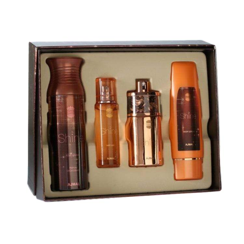 Ajmal Shine Gift Set - Women Ajmal Shine Gift Set - Women is a luminous collection that highlights the bright and elegant feminine side with coordinated products. It opens with sparkling fruity and floral top notes, develops into a radiant heart of jasmine, rose, and creamy vanilla, and rests on a warm, glowing base of musk, sandalwood, and amber. This beautiful gift set provides a complete shining experience that leaves the wearer feeling confident, feminine, and radiant throughout the day, making it perfect for gifting or personal indulgence.