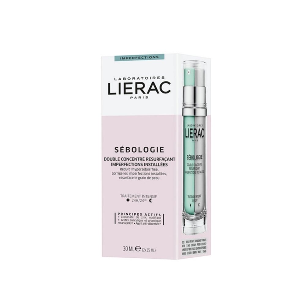 Lierac Sebologie Double Concentrate 30 ml is a powerful dual-action treatment for oily and blemish-prone skin that balances sebum production and reduces imperfections. The day serum contains zinc gluconate to regulate oil and mattify the skin, while the night serum features salicylic acid and exfoliating actives to unclog pores and refine texture. Regular use helps achieve a clearer, more even, and visibly healthier complexion.