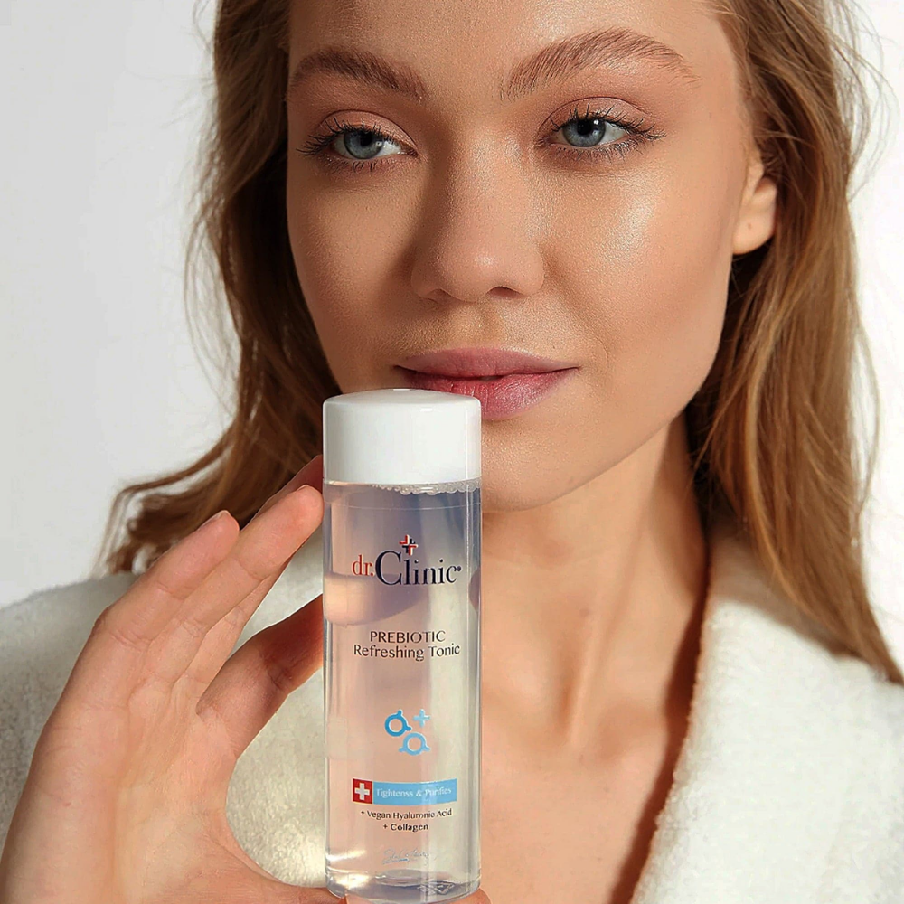 Dr. Clinic Prebiotic Refreshing Toner 150ml is a hydrating and rebalancing toner infused with prebiotic actives designed to prepare the skin for subsequent skincare steps while strengthening the skin's natural microbiome. Prebiotic compounds feed the beneficial microorganisms living on the skin's surface, promoting a balanced, resilient barrier that is better equipped to defend against environmental aggressors, pollution, and irritants. This refreshing formula sweeps away any residual impurities left after cleansing while delivering an immediate burst of lightweight hydration that plumps and softens the skin. Its gentle, alcohol-free composition makes it ideal for all skin types, including those prone to dryness, sensitivity, and redness. The 150ml bottle provides lasting daily use for those committed to a microbiome-first approach to skincare.