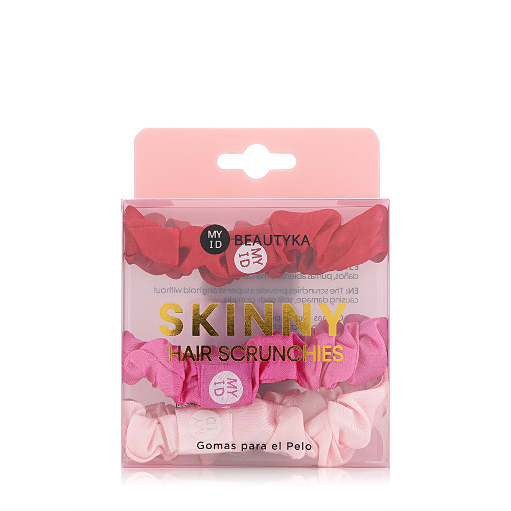My Beautika Skinny Hair Scrunchies are slim, lightweight, fabric-wrapped elastic hair ties that offer the same hair-protecting, crease-preventing benefits as traditional scrunchies in a more streamlined, subtle profile that sits discreetly in the hair without adding bulk or visual weight to the style. The narrower design makes these scrunchies ideal for creating sleek, polished ponytails, refined buns, and understated updos where a large, voluminous scrunchie would appear too casual or overpower the overall aesthetic of the hairstyle. Despite their slimmer silhouette, these scrunchies maintain the gentle, distributed-tension grip that protects the hair from the denting, kinking, breakage, and stress damage caused by thin, conventional elastic bands that concentrate all holding force on a narrow strip of hair. The soft fabric covering glides smoothly against the hair cuticle without snagging, friction, or static, preserving the integrity of blowouts, curls, and straight styles while keeping hair securely in place throughout the day.