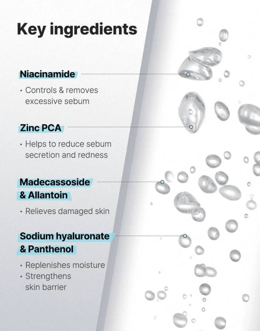 - زنك PCA: يتحكم بإفراز الدهون ويهدئ التهيج.