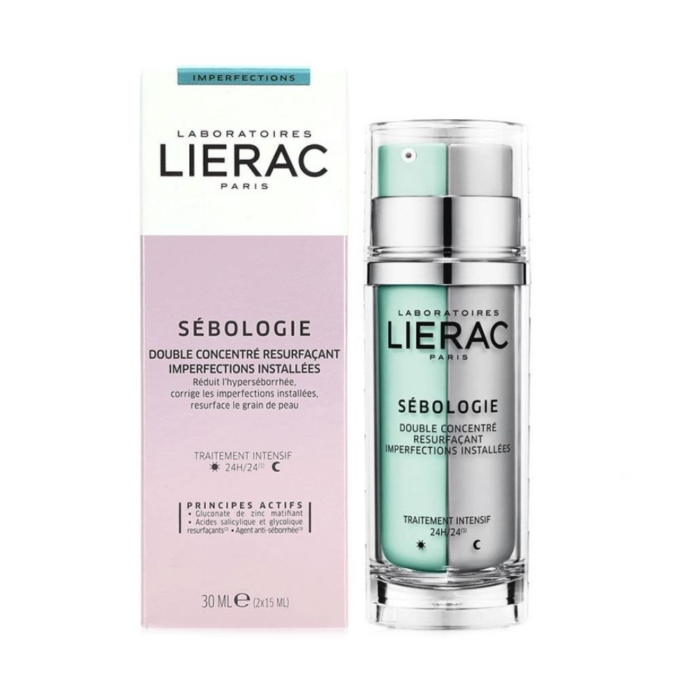 Lierac Sebologie Double Concentrate 30 ml is a powerful dual-action treatment for oily and blemish-prone skin that balances sebum production and reduces imperfections. The day serum contains zinc gluconate to regulate oil and mattify the skin, while the night serum features salicylic acid and exfoliating actives to unclog pores and refine texture. Regular use helps achieve a clearer, more even, and visibly healthier complexion.