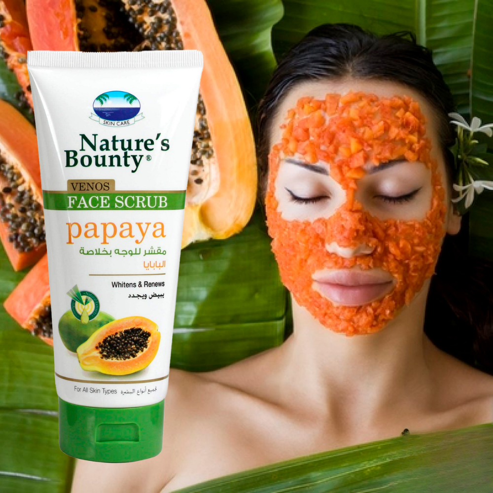 Nature's Bounty Papaya Face Scrub (200ml) is a luxurious exfoliating treatment enriched with natural papaya enzymes, walnut granules, and vitamin E to deeply cleanse, remove dead skin cells, and promote skin renewal. Its unique formula gently polishes the skin while stimulating circulation and reducing dullness, leaving the complexion soft, radiant, and glowing. Added aloe vera and glycerin provide hydration and soothing care, ensuring the skin feels refreshed, supple, and revitalized after every use, making it ideal for maintaining a healthy, youthful appearance.
