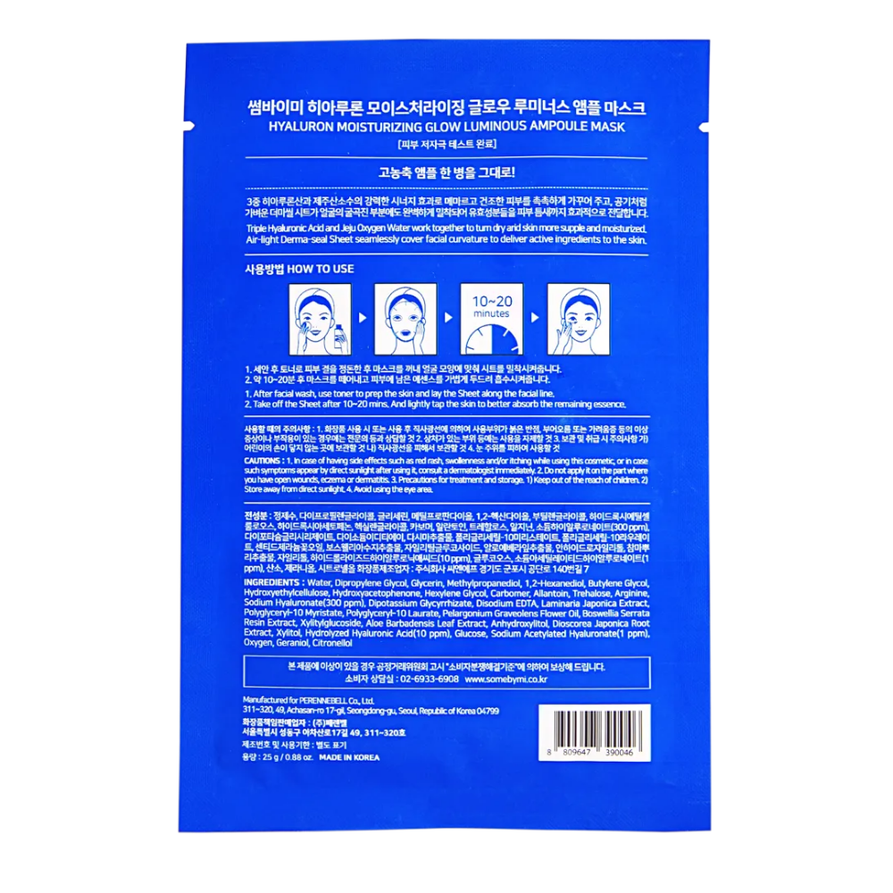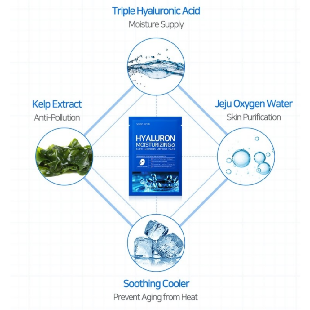 Some By Mi Hyaluron Moisturizing Glow Luminous Ampoule Mask is a deeply hydrating sheet mask powered by a multi-layered hyaluronic acid complex that delivers moisture into every layer of the skin, promoting long-lasting hydration, softness and a smooth, plump finish. The intensive ampoule formula helps replenish dehydrated skin, strengthen moisture retention and restore bounce for a healthier-looking complexion. Enriched with soothing ingredients, it calms tightness and dryness while enhancing radiance and luminosity. The mask hugs the skin comfortably to maximize absorption, leaving the face looking fresh, dewy and moisturized with a natural, youthful glow after each use.