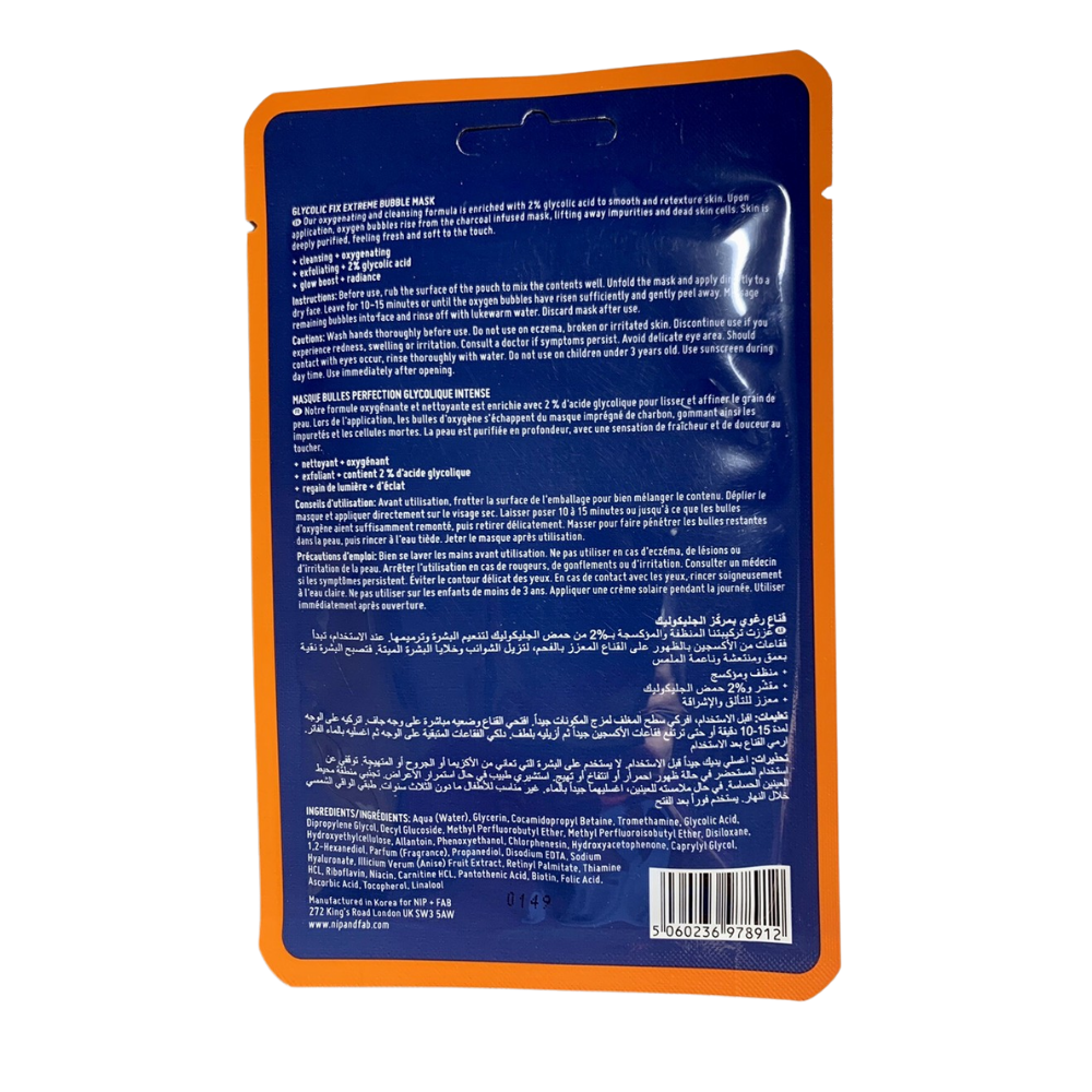 قناع نيب+فاب إكسفوليت جليكوليك فيكس بابل ماسك إكستريم (23 غرامًا) هو قناع فقاعات فاخر غني بحمض الجليكوليك ومضادات الأكسدة ومستخلصات نباتية مهدئة، ليمنح البشرة تنظيفًا عميقًا وتقشيرًا وتجديدًا. عند استخدامه، يُكوّن القناع فقاعات مُشبعة بالأكسجين تُزيل الشوائب وخلايا الجلد الميتة بلطف من سطح البشرة، مع توفير فوائد الترطيب والإشراق. الاستخدام المنتظم يُحسّن ملمس البشرة، ويُعزز إشراقتها، ويمنحها مظهرًا أكثر شبابًا وتجانسًا. تركيبته خفيفة الوزن ورغوية تضمن تجربة منعشة تُشبه المنتجعات الصحية في المنزل، تاركةً البشرة ناعمةً ومشرقةً.